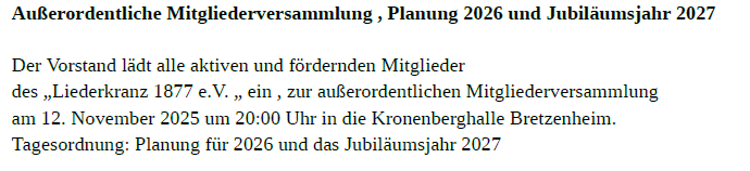 Auch der Liederkranz Bretzenheim nimmt am 18.10.25 ab 19:30 Uhr am Chorkonzert bei der 150 Jahresfeier in Breitenheim, beim MGV Breitenheim teil.