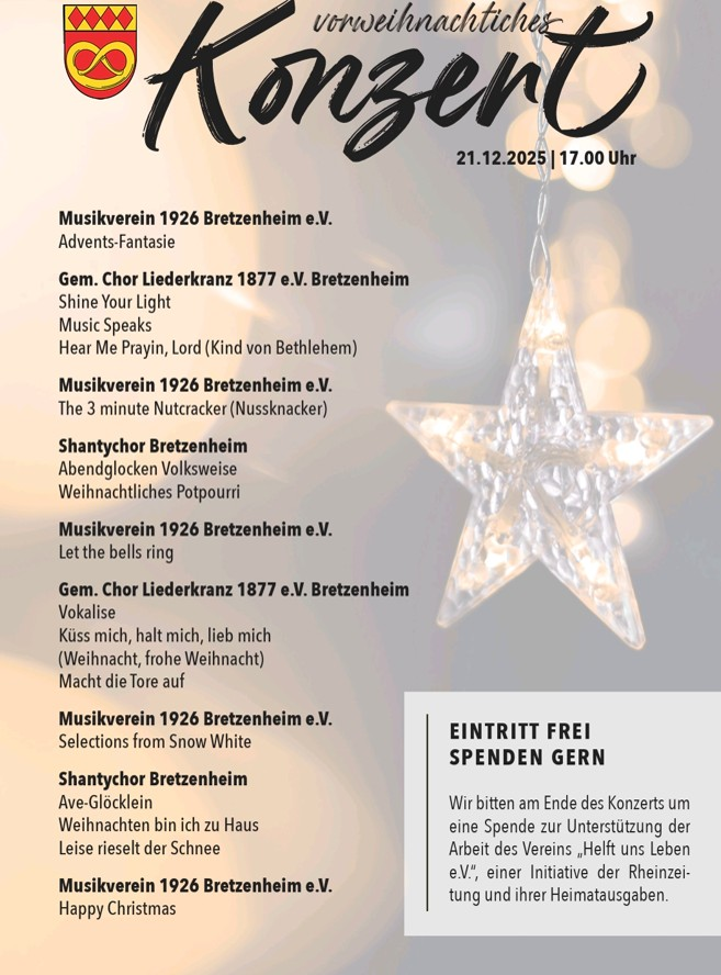 Am 21. Dezember um 17:00 Uhr findet wieder in der kath. Kirche in Bretzenheim das traditionelle Konzert statt. In diesem Jahr wieder mit dem Musikverein Bretzenheim, dem Shanty Chor, dem Liederkranz Bretzenheim mit dem Nahe-Soonwald-Chor aus Gebroth.